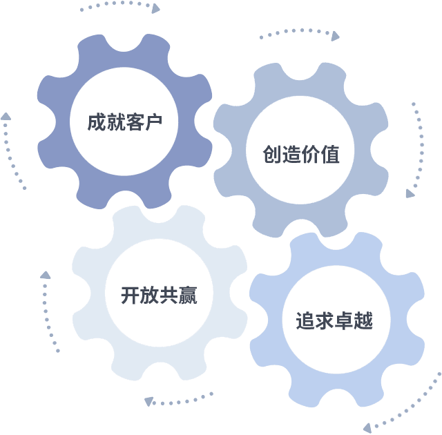 成就客户是一切决策的出发点,,,创造价值是衡量所有工作的标准,,,追求卓越是我们做事做人的态度,,开放共赢是我们的格局也是最终的结果。。。。价值观的齿轮环环相扣,,,推动着组织里的每个人不断向前。。